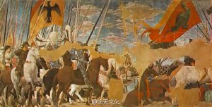 乌切罗《圣罗马诺战役》一共画了三幅,注重写生,善于专研透视学问,但有时太过于一味追求像对待数学一样进行繁琐的测量和计算了。这幅画用了复杂的远近比例,使近景中景远景都井然有序,连画中的武器、军旗都形成分割视点,以长枪斜度来展示透视关系,使透视法发展为成熟的构图,对此后文艺复兴全盛时期的绘画影响深远。