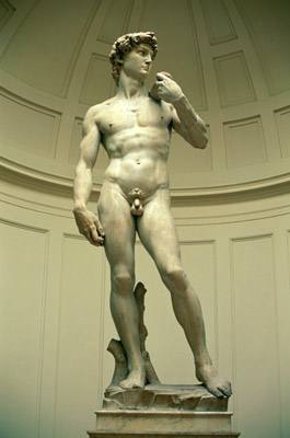 大卫像(1501~1504年,高米开朗基罗完成这件作品时才29岁。大卫是圣经中的英雄,古代犹太人的国王。他少年时代曾当过牧童,当菲利士人侵犯以色列时,大卫勇敢地用用石机杀死敌人的头领哥利亚,挽救了民族。米开朗基罗把这位古代犹太人的英雄雕刻成一个青年裸体形象,他正侧头怒视着人侵的敌人,一只手扣着肩上用石机的机弦,另一只手紧攥着,全身肌肉紧张。为体现一种古典理想美,其姿态采用了古代的歇站式。米开朗基罗没有像15世纪的多纳太罗那样把大卫雕刻成一位充满胜利喜悦的少年,而把他塑造为处于战斗前紧张状态的青年巨人。整座雕像经过高度概括和提炼,沉静的姿态中充满着动力,表现出不寻常的英雄气概。难怪这件作品完成后,被佛罗伦萨人视为英勇的佛罗伦萨共和国的象征。大卫像还集中体现了所有的男性美,今天在许多艺术院校里仍以大卫的头、手、脚和五官作为石膏写生的对象。