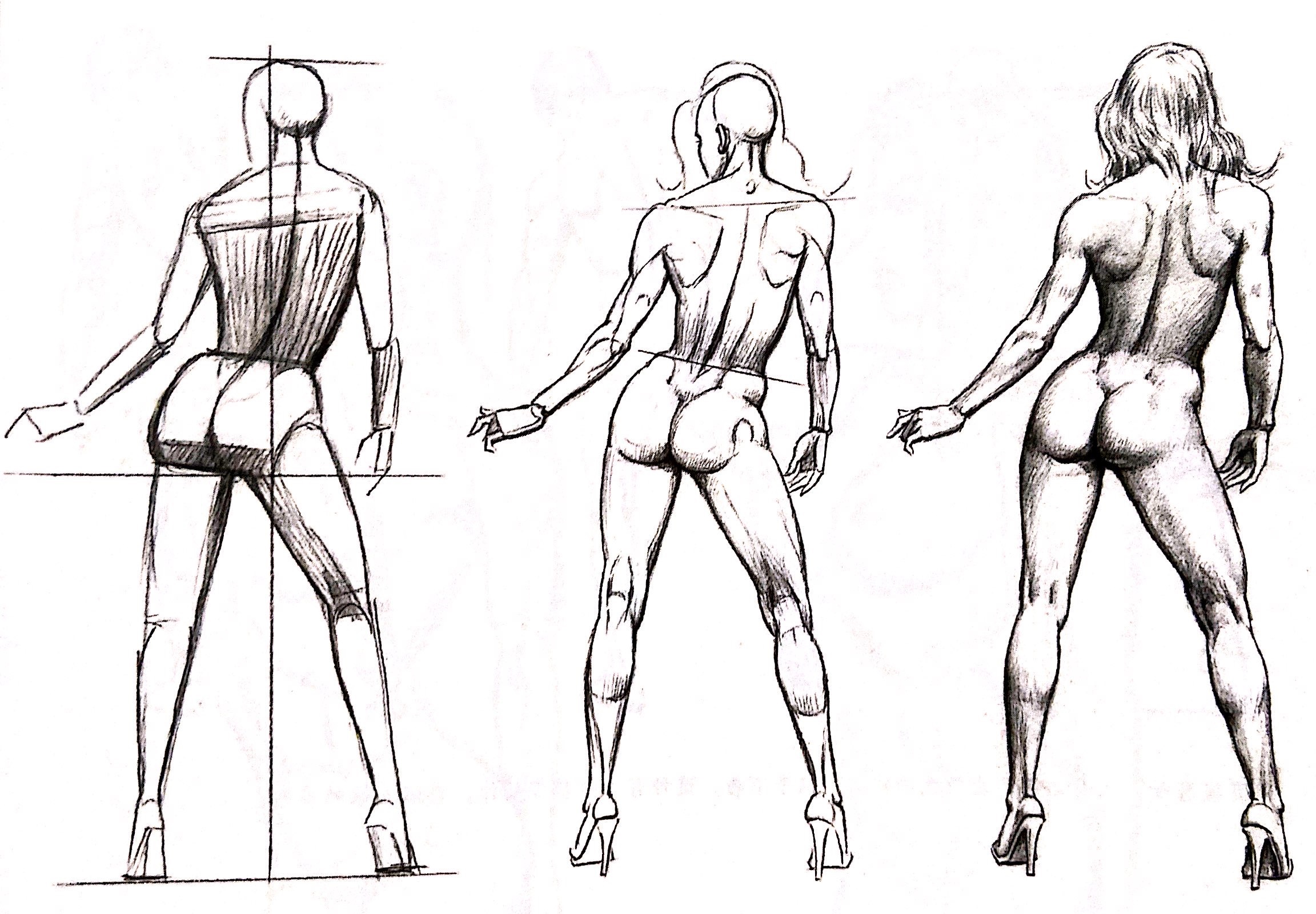 上图模特臀部向左摆动,舞蹈或一些有氧操里常常会有这种重心放在一边腿上的动作。上图模特膝盖曲度较小,曲度变大臀部摆动幅度越大。画的步骤与正面差不多。注意正面与背面人体解剖结构的区别。