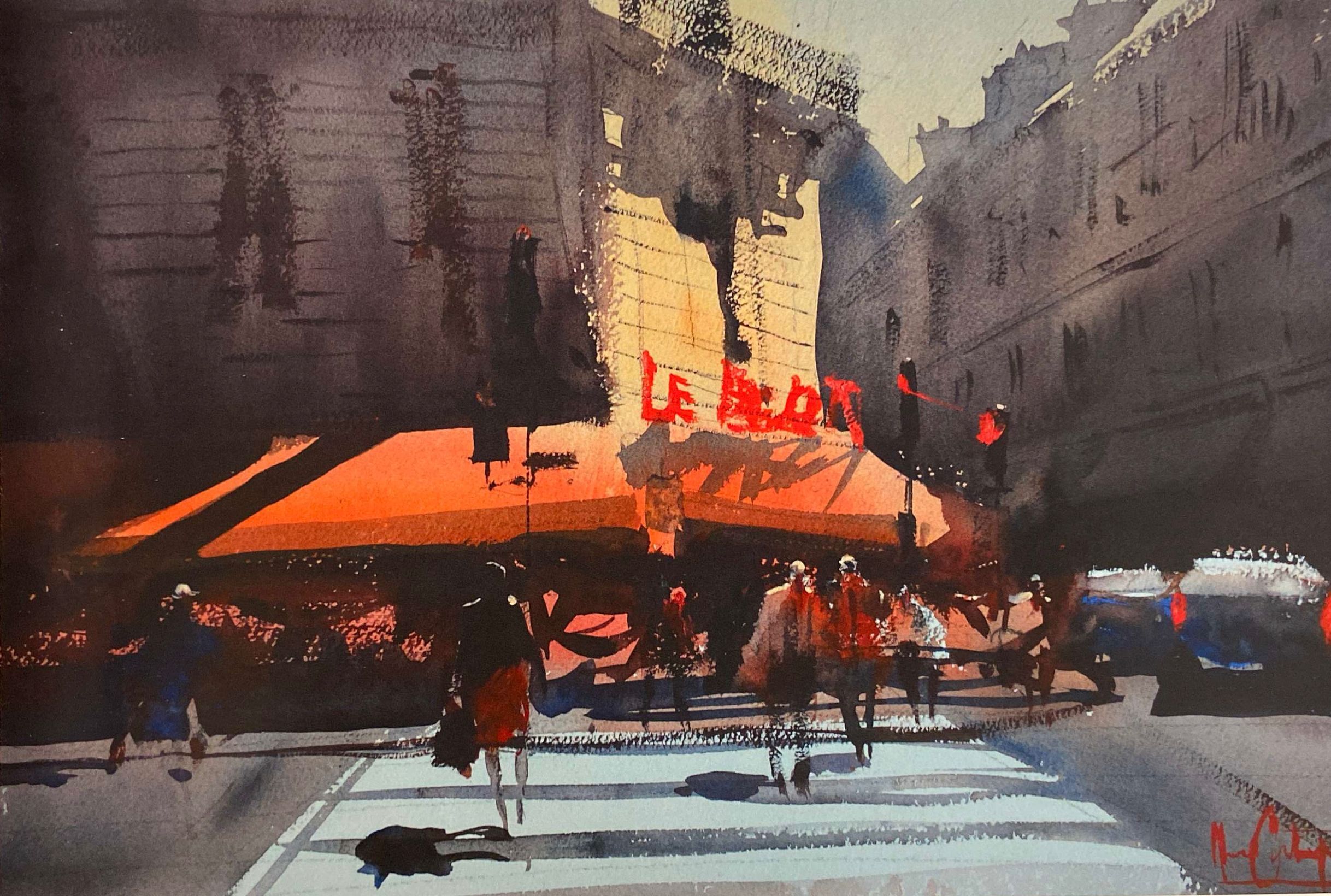 马路上的光线柔和美丽,这是由不同颜色的柔和衔接,与颜色值平滑渐进的变化来实现的。等颜色干了,就在上面用非常干的笔触来营造肌理,以及轮廓线对比所形成的画面张力。背景里也采用同样的技术,先让建筑物上的光线与天空融合,再用干笔来勾勒窗户和阳台。最后,在已经上好的颜色上,用枯笔添加交通灯。这种虚实轮廓线的结合使用在水彩画中是非常典型的。