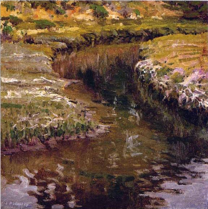 我们来看这幅作品,这是一条河流的风景写生,在自然界中,有很多的曲线物体,比如河流、道路、山脉等等,在画这些事物的时候,用S型的构图往往效果就比较好。但是再用这种构图的时候,有个细节需要注意,当S字形超出了画面的边界的时候,我们要避免我们的视线随着S的走向被引申到画面之外,就像这幅画的右下方那样,画面上作者用了一团紫灰色的色块将我们的视线留在了画面之中,还有右上方的线条处理也是如此,两条岸边的重合瞬间阻断了我们的视线游移。就这样,我们在欣赏这幅作品的时候,我们视线从前面进入,又因为作者的轮廓设计,我们的视线会一直停留在画面的中间,而不会被牵引着去联想更远的东西。