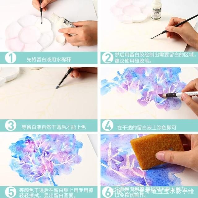 掉留白液时,就比较困难了;涂留白液的画笔要及时清洗干净,以免液体凝固后损坏笔毛;擦掉画纸上的留白液时,要用橡皮或手指从不同方向慢慢地搓擦,如果只从一个方向用力的话,极易撕坏纸张表面;揭掉留白液的纸面一般都有轻微的起毛现象,可以用金属勺等硬器轻轻压磨,使纸张平整一些。