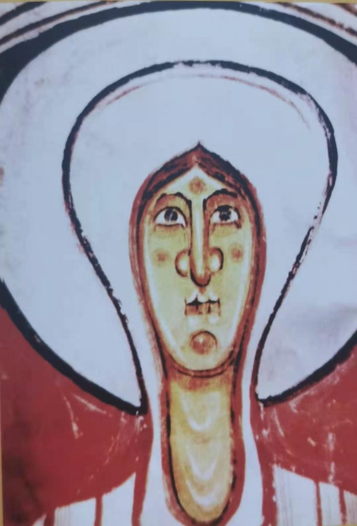 《圣母》是中世纪壁画中的圣母像。作者用线概括洗练,弧形线营造了柔美的感觉。圣母头部上笼罩的圣光里,大面积的空白使人物面部显得突出而精美。