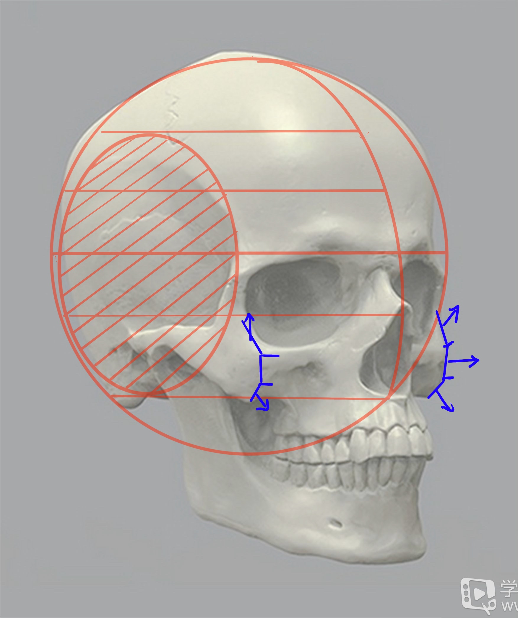而整个头骨可以看作是长方体,分成六个面,当然我们的重点在正面和侧面。