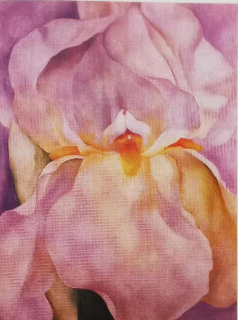《白色蝴蝶花》是美国画家乔治亚.奥克弗的作品。作品表现一朵巨大的、呈现淡紫色的白蝴蝶花,花中间吐出黄色的花蕊,娇艳的黄在淡紫色调中显得格外耀眼。作者通过色彩的冷暖对比,表现了自然界旺盛的生命力。