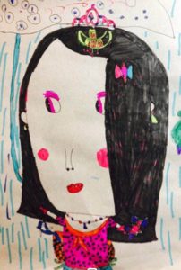 在教学过程中,有些孩子爱爸爸爱妈妈,并非会用口头来进行表达,使用绘画的形式来表达对于亲情的寄托,每个家庭氛围都能体现于绘画上。有一个学生:小名源源,今年5岁,之前没有参加过任何绘画类培训,爸爸反映她爱在画纸上涂鸦,画自己喜欢的小公主。家人也从未限制她在画纸上的表达,在于我们看来,他们家是以一种自由的态度在支持她画画,爸爸说只要她喜欢就好,所以现在有一个很明显的特点,在课堂上,我给予一个主题,她可以很快的画出自己想法和当下绘画时的情感。小朋友也有自己的想法和情绪,例如下图中的人物表现。当时这张作品,爸爸觉得小朋友画的很棒,问了些问题(图二)。其实通过系统的绘画,除了学习的环境影响,当然还会有老师的引导方式在慢慢的让孩子们更有信心和勇气表达自己的情感和想法,所以绘画不仅仅是一种很好丰富情感的方式,画画过程中所见所闻也能拓展自己的艺术视野。